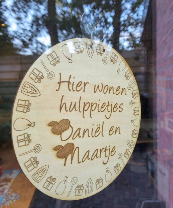 Hang een leuke raamhanger voor het raam, met de namen van de hulppietjes. Verkrijgbaar in een cirkel en een pietenmuts.